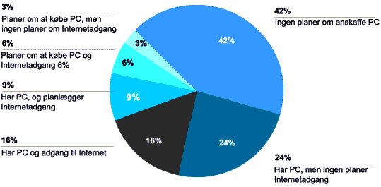 Som man se er det faktisk ikke familierne, der har de mange PCer. Da hele 42% af de danske familier ikke har valgt at have PCer, må det altså være erhvervslivet og det offentlige, der trækker gennemsnittet op. Samfundets drift er altså en ting computere har stor betydning for.