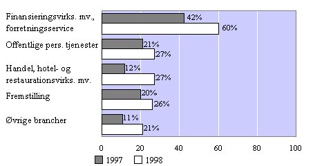 Endvidere har erhvervslivet også oplevet en udvikling i brugen af computer. Den udvikling er som udviklingen hos de danske familiers internetopkoblinger også gået stærkt. Herunder har vi indsat et diagram, der viser hvor mange % af de ansatte i forskellige erhvervsgrupper, der har adgang til internet henholdsvis i 1997 og 1998: